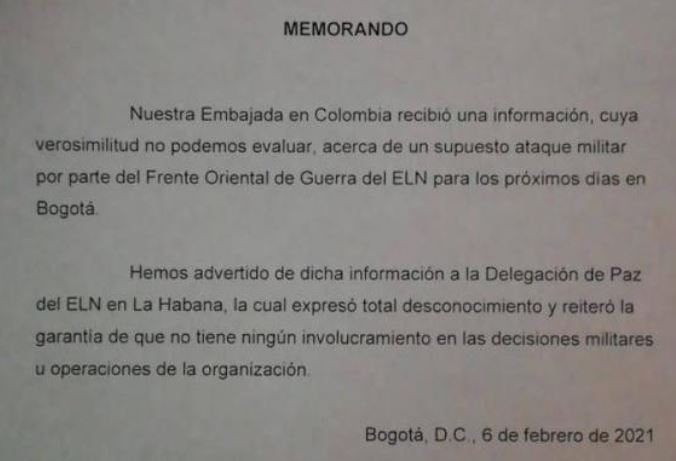 Colombia se encuentra bajo un análisis de riesgo de parte de las Fuerzas Armadas nacionales, debido a que se conoció un comunicado que la embajada de Cuba en cabeza de Jose Luis Ponce entregó directamente a la cancillería colombiana, una carta en donde advierte de una incursión militar en la capital del país de parte del grupo terrorista ELN.