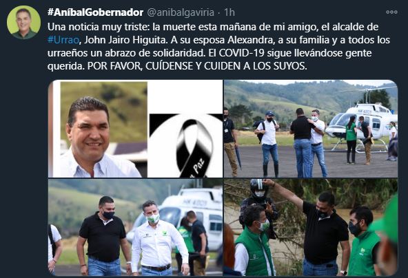 Una noticia muy triste: la muerte esta mañana de mi amigo, el alcalde de #Urrao, John Jairo Higuita. A su esposa Alexandra, a su familia y a todos los urraeños un abrazo de solidaridad. El COVID-19 sigue llevándose gente querida. POR FAVOR, CUÍDENSE Y CUIDEN A LOS SUYOS. pic.twitter.com/rC15zaC4xG