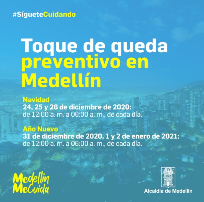 Es un hecho que la capital de Antioquia entrará en toque de queda nocturno durante las festividades de fin de año. La alcaldía anuncio a través de twitter que los días 24, 25 y 26 de diciembre el toque de queda iniciará a la media noche y terminará a las 6:00 am cada día.